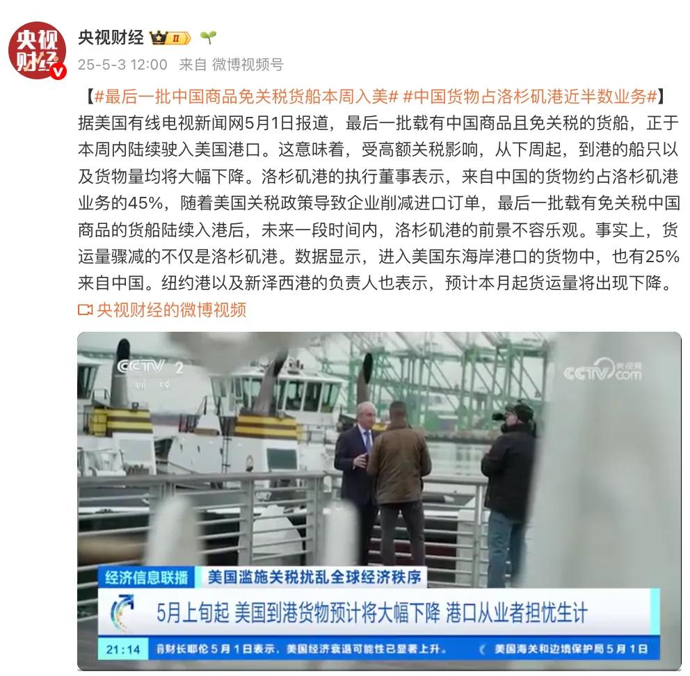 5月3日,据央视财经援引美国有线电视新闻网5月1日报道,最后一批载有中国商品且免关税的货船,正于本周内陆续驶入美国港口。这意味着,受高额关税影响,从下周起,到港的船只以及货物量均将大幅下降....